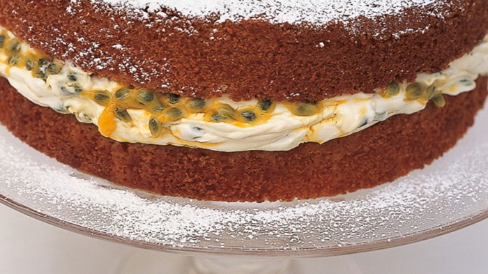To make this, first slice the passion fruit into halves and, using a teaspoon, scoop all the flesh, juice and seeds into a bowl. Next, in another bowl, combine the mascarpone, fromage frais, sugar and vanilla extract, using a balloon whisk, which is the quickest way to blend them all together. After that, fold in about two-thirds of the passion fruit. Now place the first sponge cake on the plate or cake stand you are going to serve it on, then spread half the filling over it, drizzle the rest of the passion fruit over that, then spread the remaining filling over the passion fruit.