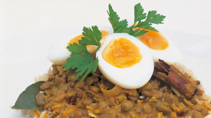 When the sauce is ready, season it well with salt and add the lime juice. Now peel the eggs under cold running water, slice them in half and pop them on top of the sauce, giving everything a couple more minutes' cooking with the lid on. Serve the egg curry with rice, some more lime pickle and perhaps some mango chutney to add a touch of sweetness.