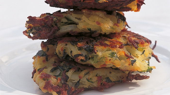 To cook the rösti, pre-heat the oven to gas mark 7, 425°F (220°C), placing the baking tray on the top shelf of the oven. Melt the butter and add the oil, then brush the rösti on both sides with the mixture. When the oven is up to heat, place the rösti on the baking tray and return it to the top shelf of the oven for 15 minutes, then turn the rösti over and cook them for a further 10 minutes.
