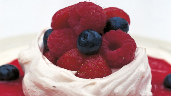 To assemble the meringues, whisk the filling ingredients together, spoon equal amounts into each meringue and top with equal amounts of the fruit. Then dust with icing sugar before serving.