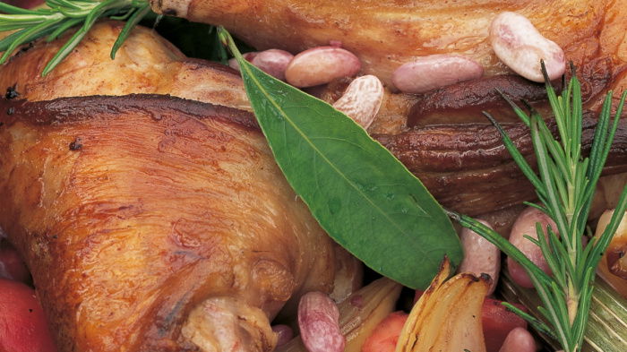 When they’re nicely browned, remove them to a plate and, keeping the heat high, add the celery, onion and carrots and brown them as well, turning and tossing them around for about 6 minutes. Now stir in the garlic, cook for one minute, then add the drained beans and give everything another good stir. Next, add the tomatoes, wine, bay leaf, chopped rosemary and some seasoning. Then, finally, place the lamb shanks on top and when everything is beginning to simmer, cover with the lid and transfer the casserole to the oven to braise very slowly for 3 hours.