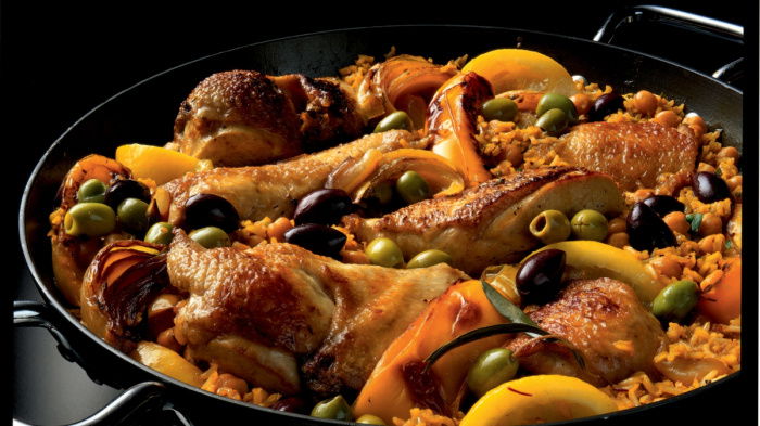 Now scatter the olives in and, finally, place the pieces of chicken on top of everything. Cover with a tight-fitting lid and place in the pre-heated oven for 1 hour or until the rice and chickpeas are tender. Then, just before serving, scatter the coriander leaves on top and serve straight away on warmed serving plates.