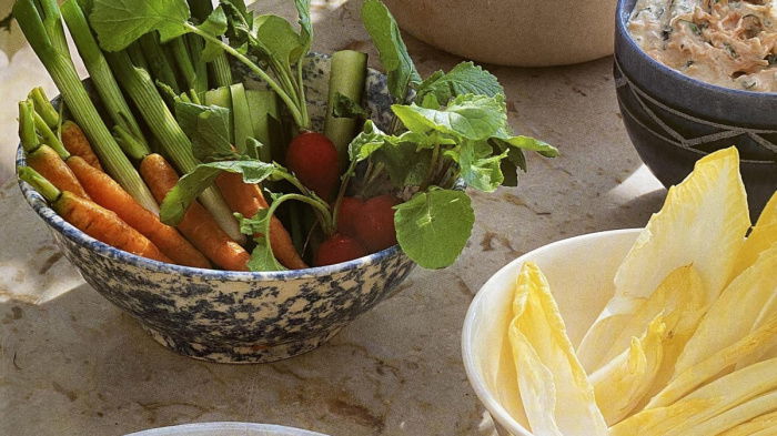 To make the carrot, coriander and fromage frais dip: first of all, dry-roast the coriander and cumin seeds in a small pan over a medium heat for about 45-60 seconds. Then crush them finely with a pestle and mortar. Now, in a bowl, mix together all the ingredients, then season and cover with clingfilm. Leave to stand for 15 minutes before serving to allow the flavours to develop. To assemble the crudités, simply cut the celery and cucumber into batons. Then arrange in bowls with the other vegetables and serve with the dips