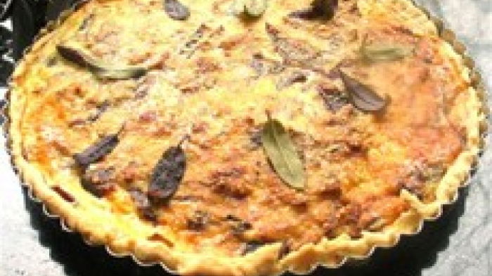 Then brush each reserved sage leaf with a little oil and arrange them on top of the tart, and return it to the oven for another five minutes or until the centre feels springy.