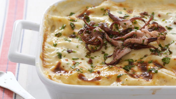 Now you can assemble the lasagne, so spread a large spoonful of the béchamel over the base of the dish, then cover with sheets of lasagne, cutting them with scissors to fit the dish evenly, rather than overlapping them. Spread a third of the fish mixture over the pasta, followed by about a quarter of the remaining béchamel, then continue to layer everything, finishing off with a layer of pasta covered with the remaining béchamel sauce. Bake the lasagne in the oven for 40-45 minutes until the sauce is bubbling and the top is golden-brown. When you remove it from the oven leave it to rest for 10 minutes, and while that’s happening heat 1½ tablespoons of olive oil in a small frying-pan, then add the squid tentacles and garlic and sauté gently for two minutes. Stir in the parsley and some seasoning and sprinkle this mixture (and all the juices from the pan) over the top of the lasagne before serving.