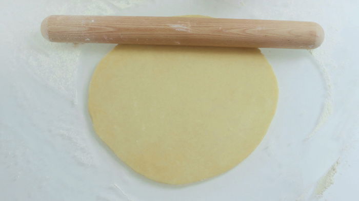 Lightly dust the pin with flour and rest it on the centre of the dough. Place the flat of your hands lightly on each end of the pin and begin to roll the dough backwards and forwards (don’t be tempted to roll from side to side), gently and evenly, re-dusting the pin and the surface very lightly with flour if you need to stop the pastry sticking.