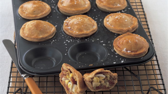 Meanwhile, grill (or fry) the bacon gently until the fat begins to run and pre-heat the oven to gas mark 6, 400°F (200°C). Roll out half of the pastry, on a lightly floured surface, cut out 12 rounds using the 3½ inch (9 cm) cutter and line the patty tin. Now peel and chop the eggs quite small and chop the bacon fairly small, too, Then divide the egg and bacon among the pies and season with freshly milled pepper and a very little salt. Beat the remaining egg together with the milk and carefully pour the mixture into the pies, allowing it to settle as you go. Dampen the edges and roll out the rest of the pastry to cut out the smaller rounds for the lids. Make a small hole in the centre of each pie, brush the tops with milk, then bake for 10 minutes.