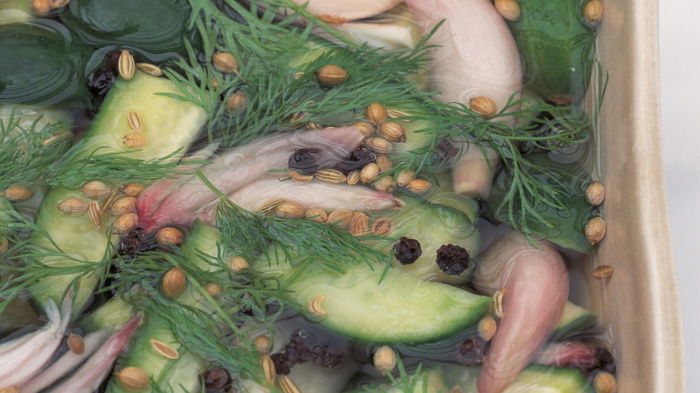 First of all, cut the cucumbers in half lengthways and then in quarters lengthways, then cut them on the diagonal into 1 inch (2.5 cm) chunks. After that, peel and slice the shallots in half through the root, then into three. Next, you need to place the cucumbers and shallots in layers in a non-metallic colander and sprinkle with the salt between each layer, making sure they are fairly evenly coated. Then place a plate over them, press it down with a scale weight, or something equally heavy, and leave them overnight so the salt can draw out the excess moisture. Put a dish underneath the colander to catch the drips.