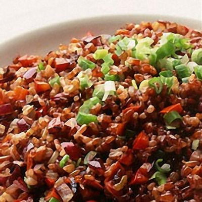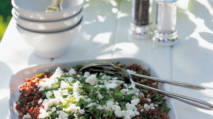 Then transfer the warm rice to a serving dish, pour the dressing over and mix thoroughly. Taste to check the seasoning and leave aside until cold. Then add the shallots, the rocket and the spring onions. Finally, just before serving, crumble the Feta cheese all over.