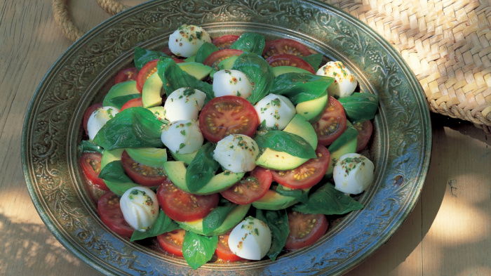 It’s not recorded if it was specifically created to echo the colours of the Italian flag, or whether some inspired chef assembled these ingredients and suddenly appreciated their significance. Either way, it’s a lovely combination of textures and flavours. Mozzarella is now sold as baby bite-sized cheese called bocconcini, which look particularly attractive here.