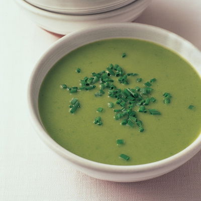 After that pour in the stock, season and, after a couple of stirs, bring it back to a gentle simmer. Put the lid back on so it can simmer gently for another 20 minutes. When the time is up, use a stick blender to purée the soup, making sure there are no escaped bits of cucumber that the blades didn’t catch – it will finish up a magnificent fresh green colour, very pretty. Reheat gently and serve in warm soup bowls with some cream swirled into each one and a few chives sprinkled over.