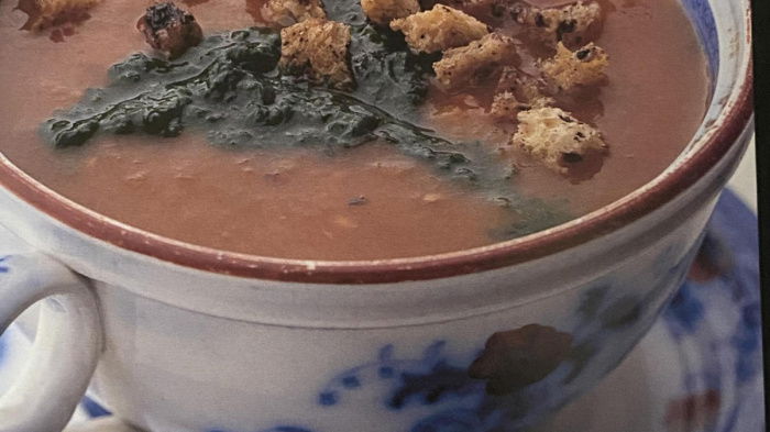 When the tomatoes are ready, remove them from the oven, but leave it switched on. Arrange the croutons on a small baking tray and put them in the oven to bake for about 8 minutes using a timer. Now scrape the tomatoes and all their juices into a food processor, rescue the garlic cloves from the tray, and then simply squeeze the pulp to join the tomatoes and discard the skins. Then add the contents of the potato saucepan and whiz everything to a thick purée, not too smooth. If you want to, you can sieve the pips out, but I prefer to leave them in because I prefer that texture. The soup is now ready for reheating – very gently. Just before serving the soup make the basil purée.