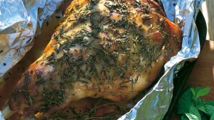 Next, spread a large sheet of foil over the roasting tin, place the lamb on it and stab the fleshy parts of the joint several times with a skewer. Now spread the rosemary mixture all over the upper surface of the lamb and tuck in a sprig of rosemary (as this makes a nice garnish later). Then bring the edges of the foil up over the lamb, make a pleat in the top and scrunch in the ends. This foil parcel should be fairly loose to allow the air to circulate. Bake the lamb for 2 hours, then open out the foil, baste the joint well with the juices and return it to the oven for a further 30 minutes to brown. The above cooking time should result in lamb very slightly pink: you can cook it for more or less time, as you prefer.