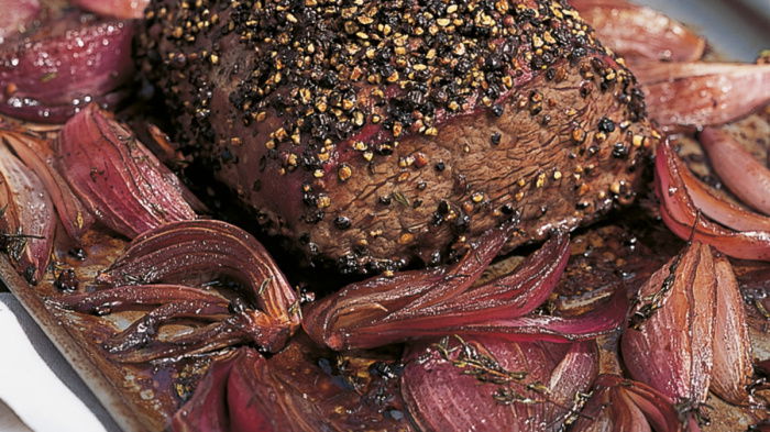 For medium, remove the onions after the 30 minutes, keep them warm, and give the beef another 10 minutes with the oven switched off. If you like it well-done, leave it for another 15-20 minutes. Either way, keep everything warm while you make the sauce. To do this, put a quarter of the onions into a small saucepan over a medium heat, then stir in the flour to just coat the onions and gradually whisk in the red wine, Worcestershire sauce and balsamic vinegar. Let it just come up to simmering point, then turn the heat down and simmer gently until the sauce has reduced by about a quarter. To serve, carve the beef, pouring any escaped meat juices into the sauce, and serve garnished with the onions, the sauce poured over.