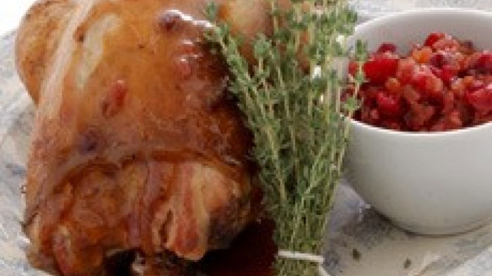 Discard the muslin and leave the birds to rest in a warm place whilst you make a gravy. Spoon off all the excess fat from the roasting tin, and place the tin over a medium heat. Stir in a little flour till smooth, then gradually add enough stock to make a thinnish sauce. Season with salt and freshly milled black pepper and let the gravy bubble and reduce before stirring in the redcurrant jelly and the port or Madeira. Serve the pheasant with the gravy and Cranberry and Onion Confit handed round separately.