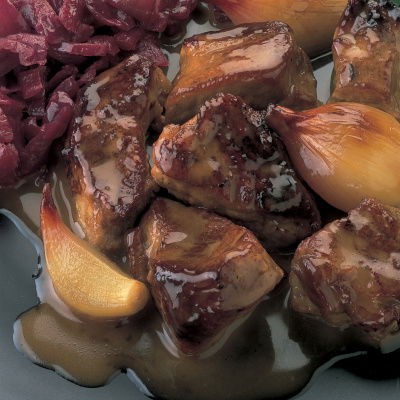 When the fillets are cooked, remove them to a warmed serving dish and now make the sauce. Place the roasting tin over direct heat and stir in the flour. Mix, then allow this to brown for a couple of minutes before gradually adding in the cider and stock. Let it bubble for a bit and reduce for 3-4 minutes, then season and strain the sauce and serve immediately with the meat, cut into slices.
