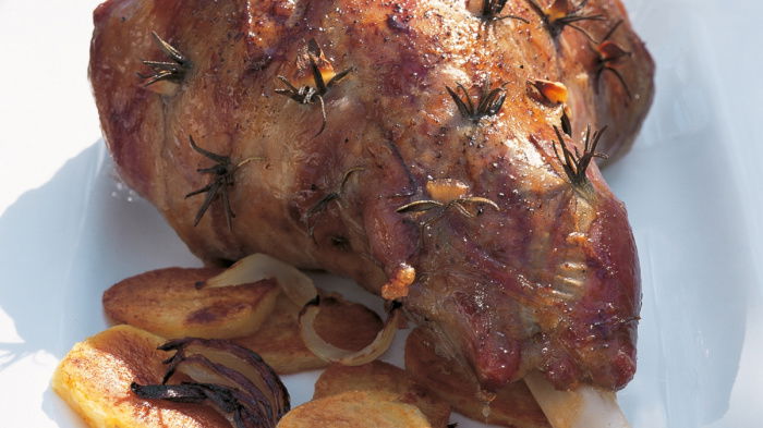 Then push a sliver of garlic, followed by a small sprig of rosemary, into each cut, and season the meat generously with salt and freshly milled black pepper. Next, cut the onion in half and place it in the bottom of the roasting tin, then transfer the lamb to the tin to sit on top of the onion halves. Cover the tin loosely with foil, then cook in the oven on a high shelf for 1½ hours. After this, take the foil off and let it cook for another 30 minutes. Remove the lamb from the oven, cover loosely with foil again and allow to rest for about 20 minutes.