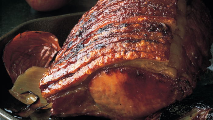 Let it bubble for a minute, taste to check the seasoning and then pour it into a warm serving jug. You can then remove the onion, or not. To carve the pork, simply slide the knife all the way along the central bone to remove it. Then remove the rib bones, which will come away in one piece. The pork will then be ready to carve in even slices.