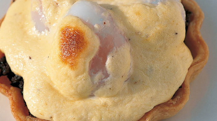 With everything ready – the mushroom filling, the tartlet cases, the Foaming Hollandaise and the poached eggs – you can now assemble the tartlets.
