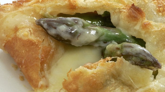 In this recipe, asparagus is encased in very thin, crisp parcels of puff pastry with melted cheese.