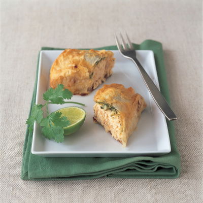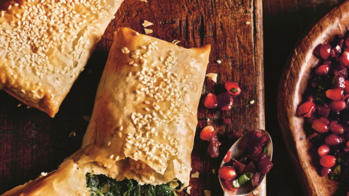 So here I have combined spinach and slices of Camembert in a filo pastry parcel with what I would call a salpicon: diced cooked beetroot and shallots with pomegranate seeds and molasses. So there we have the greens and shiny reds like little jewels, as David Pritchard, the television director I worked with for years, would have said. This recipe is a little treat for times when there’s just a couple of you, but of course you can double it up if you like.