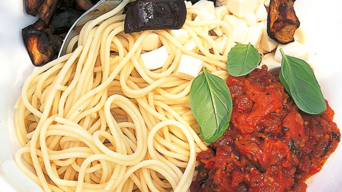 Now drain the pasta, pile it into a warm bowl, spoon the tomato and aubergine mixture over the top and scatter over a few basil leaves.