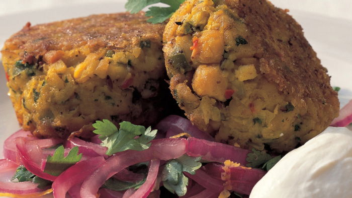 As soon as the mixture is cool enough to handle, form it into 12 patties for a starter. They should be about 2 inches (5 cm) in diameter and ½ inch (1 cm) thick, or 8 larger patties if you are serving them for a main course. Now coat each one first with beaten egg then toss them around in the wholemeal or chickpea flour. Next heat a couple of tablespoons of oil in a frying pan on a high heat and when it's really hot, fry the cakes in two batches to a golden brown colour, about 1 minute on each side.