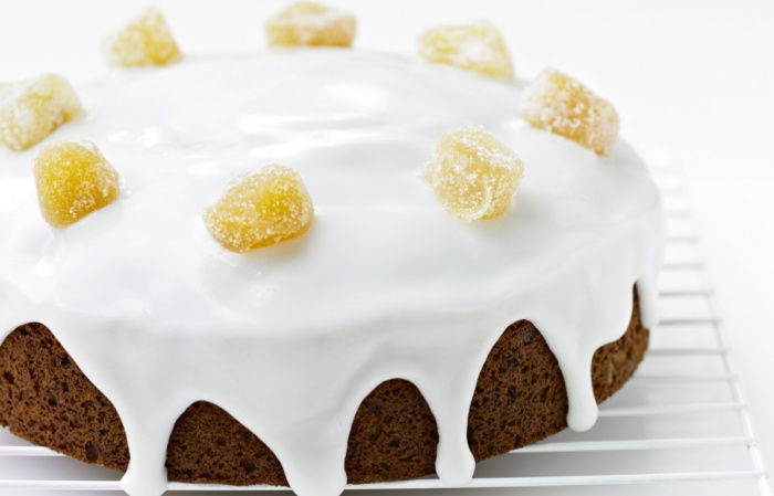 It's an easy sponge cake, which is cooled then covered with a simple icing and decorated with little pieces of crystallised ginger.